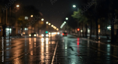 street, road, night, rain, wet, city, urban, reflecting, blurred, blur, car, headlamp, rear lamp, driving, vehicle, tree, sidewalk, building, exterior, street light, illumination, glowing, light, dark, traffic, transportation, transport, weather, night time, evening, season, atmosphere, mood, scene, abstract, spot, artistic, background