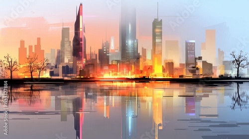 city landscape, sunset, urban, building, skyscraper, water, evening, skyline, modern, architecture, city landscape, city view, metropolis, twilight, city lights, golden hour, river, lake, urban scene, evening light, urban development, highrise, downtown, city life, urban area