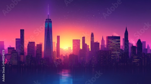 city landscape, sunset, skyline, urban, metropolis, building, skyscraper, silhouette, water, neon, vibrant, colourful, horizon, calmness, evening, modern, architecture, downtown, dusk, light, glow, picturesque, sunrise, atmospheric, scenic, digital artwork, illustration, fantasy, futuristic, dreamlike, illuminated, gloaming, artistic, background, serene, city, travel, panorama, design, graphic, creative, peaceful, imaginary, ambience, warm, shades, composition