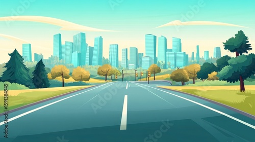 city, road, skyline, building, urban, highway, street, travel, city landscape, destination, avenue, infrastructure, traffic, metropolis, perspective, skyscraper, modern, architecture, downtown, journey, route, transportation, landscape, environment, outside, pathway, scene, background, town, drive, grass, tree, blue, sky, cloud, horizon, direction, scenery, sunlight, peaceful, nobody