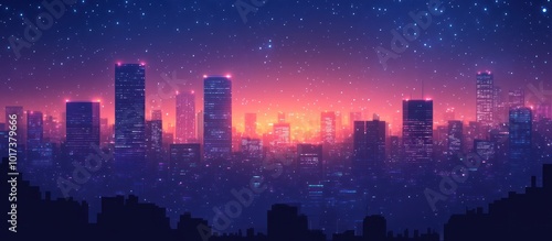 city, night, sky, city landscape, skyline, urban, building, building, metropolis, star, purple, pink, sunset, dusk, fog, glow, light, architecture, modern, concrete, tower, skyscraper, downtown, abstract, background, design, silhouette, illustration, landscape