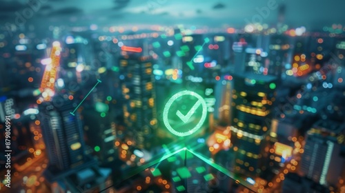 city landscape, city, night, light, urban, skyline, metropolis, city landscape, city life, checkmark, icon, symbol, digital, technology, future, success, approval, achievement, verification, confirmation, green, glowing, illuminated, night time, abstract, background, graphic, design, illustration