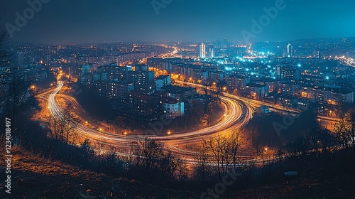 city, night, traffic, light, urban, city landscape, road, long, exposure, building, town, dark, evening, view, illuminated, car, streak, driving, travel, skyline, architecture, transport, motion, blur, downtown, street, modern, residential, glow, light, vehicle, aerial, scene, perspective, outdoors, infrastructure, illumination, rush, hours, route, movement