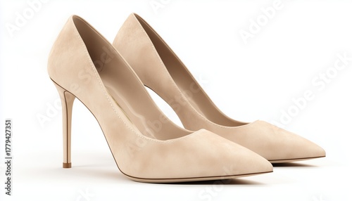 Classic Beige Pointy Toe Women'S High Heel Shoes In Suede Leather On White Background. Mock-Up Template For Female Stiletto Heels.