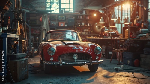 car, vintage, garage, red, classic, automobile, auto, vehicle, workshop, retro, old, metal, engine, wheel, tire, rust-eaten, light, shadow, tool, chrome, interior, door, floor, window, brick, iron, wood, steel, machinery, industrial, workspace, work, mechanic, detail, photo, composition, style, lighting, gold, hours, design, space, automotive, machine, industry, culture