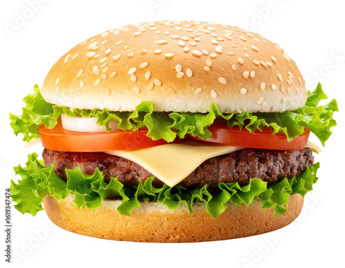 Classic cheeseburger with lettuce and tomato on transparent background PNG