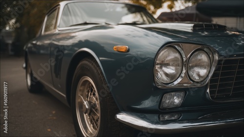 Classic elegance of a restored teal blue vintage sports car head on perspective