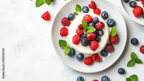 Classic panna cotta with a smooth texture, topped with fresh berries and mint, elegantly plated with space for text on a neutral background.
