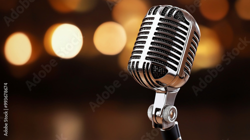 Classic retro microphone with shiny chrome finish, set against blurred bokeh background, evokes sense of nostalgia and excitement for music and performance