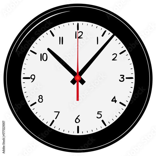 Classic round wall clock, black bezel, red and black hands, ten past twelve