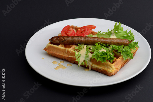 Classic sausage on waffles breakfast with tomatoes, salad and sauce served on a white plate on black background.