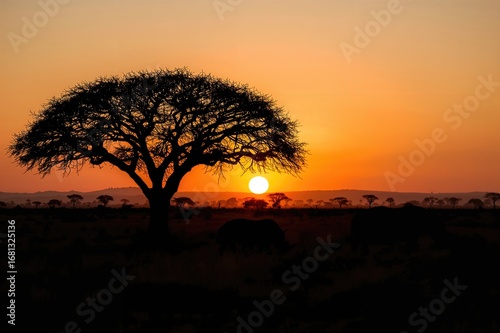 Classic savanna landscape featuring a large acacia tree silhouette with a rhinoceros at sunset in the wild