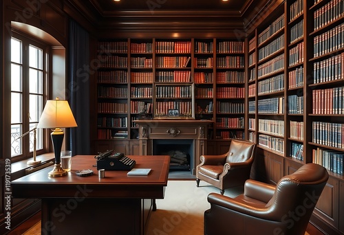 study, room, library, book, fireplace, leather, chair, desk, typewriter, wood, rich, dark, classic, sophisticated, elegant, warm, comfortable, vintage, antique, reading, writing, home, office, luxury, residential, interior, design, decor, furniture, space, ambience, atmosphere, calm, serene, peaceful, relaxing, traditional, old, grand