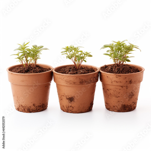 Clay flower pots and soil, isolated on white, ai technology
