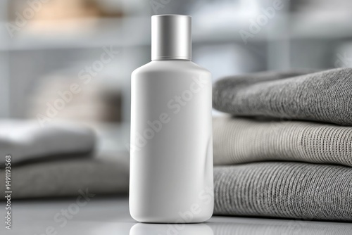 Clean white bottle with silver cap stands elegantly on a polished surface beside a stack of folded, soft grey sweaters in a softly lit, serene home setting.