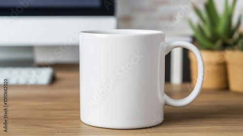 Clean White Ceramic Mug on Office Desk with Computer and Succulent Plant Mockup