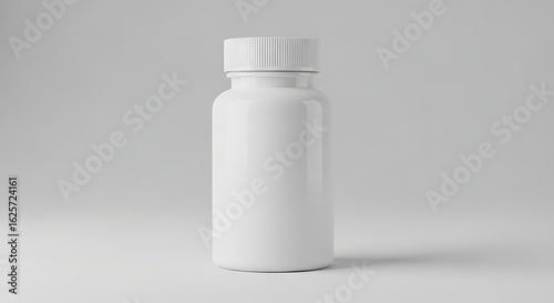 Clean white medicine bottle with ribbed cap on a light gray studio background, isolated product shot