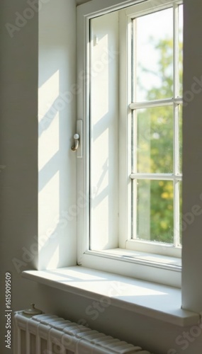 Clean white plastic window frame, bright light, clear, interior design, blank