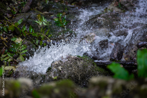 Clear and fresh mountain spring water flows and splashes over a stone - Macro photo of the cold and clear water drop - Concept of fresh, potable and unpolluted water