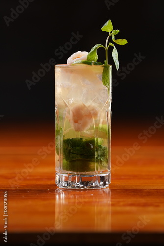 Clear citrus mint beverage with ice and fruit segments, showcasing freshness and natural herbal elements.