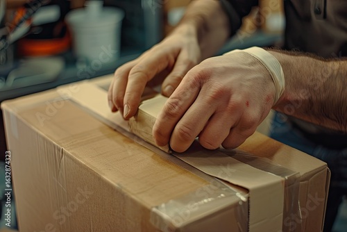 Clear Pixel Visual of Man Taping Cardboard Box for Shipment in Ecommerce Warehouse