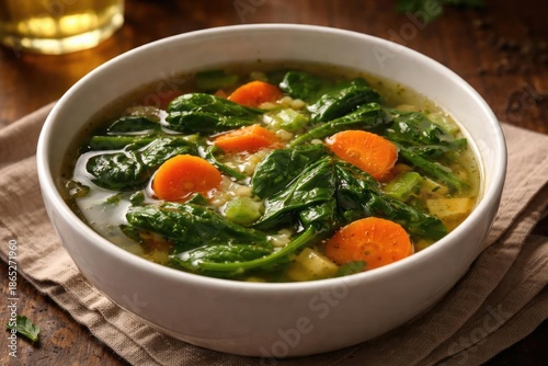 Clear vegetable broth with spinach and carrot chunks presented in white bowl on wood