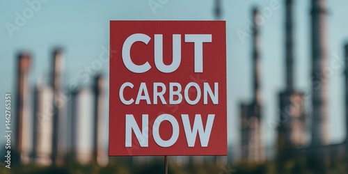 Climate change action with carbon awareness idea. Sign urging action against carbon emissions with industrial background.