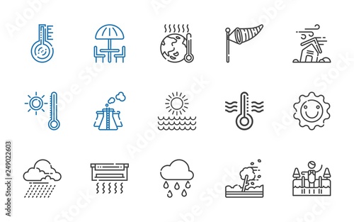 climate, icon, set, vector, cold, water, hurricane, raining, air, conditioner, storm, sun, thermometer, pollution, wind, signs, global, warming, umbrella, illustration, symbol, design, isolated, weather, background, white, season, nature, temperature, graphic, heat, element, object, concept, meteorology, hot, warm, natural, flat