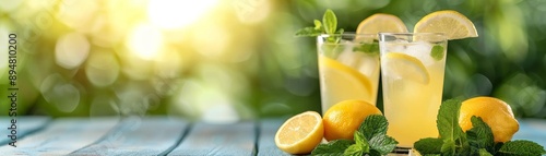lemonade, drink, beverage, refreshment, glasses, clinking, toast, summer, sunny, nature, outdoors, garden, table, deck, patio, blur, natural light, fresh, citrous, fruit, mint, flora, foliage, green, golden hour, mood, lifestyle, relax, enjoy, cheer, happy, party, friends, family, holiday, vacation, leisure, picnic, bar-b-q