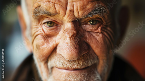Close portrait of a very elderly man smiling looking at the camera, photo, white light background