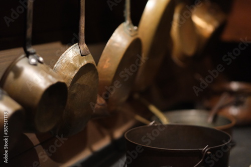 old, tradition, vintage, copper, antique, traditional, utensil, background, blur, blurred, brown, closeup, closeup, defocused, group, hanging, kitchen, metal, no people, soft focus
