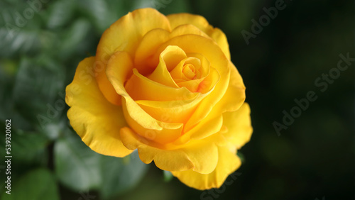 Close up beautiful yellow Rose. Open incredibly beautiful yellow Rose in the garden. Floral background. Soft focus. Natural floral background. Horizontal photo. Without people. Beautiful postcard