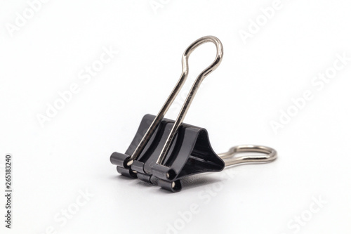 Close up black paper clip isolate on white background.Selective object on white.