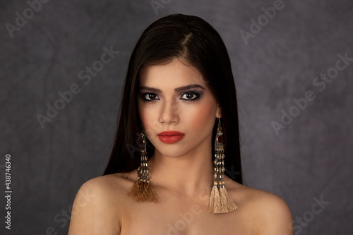 accessory, advertisement, asian, attractive, background, beautiful, beauty, brunette, charming, copy space, cosmetic, earring, elegance, ethnic, face, fashion, fashionable, female, girl, glamour, gorgeous, hair, indian, long hair, look, make-up, model, person, pose, posing, shoulder, shoulder, skin, skincare, studio, style, woman