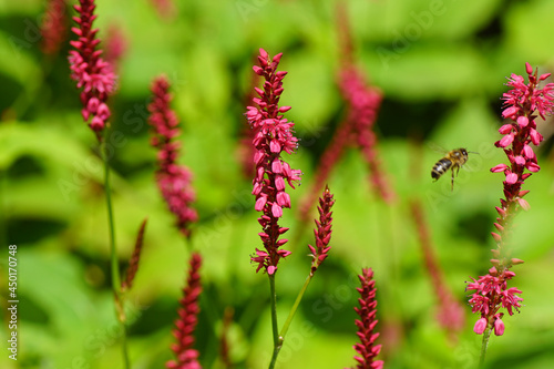 Close up flowers of Knotweed, knotgrass (Polygonum amplexicaule), family Buckwheat (Polygonaceae). Dutch garden, Summer, August, Netherlands.