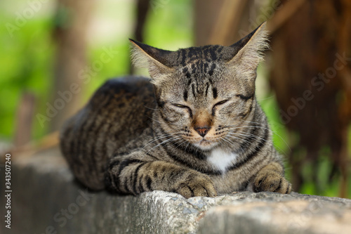 Close up gray cat house is sit down and sleep on the old wall near the garden at thailand