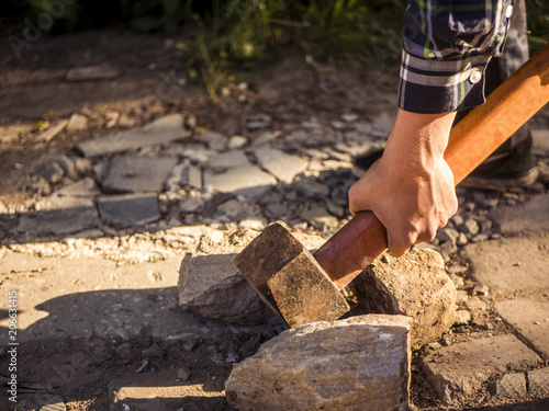 close up hand in shirt holding a hammer and crashing the stone against sun outdoor