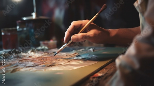 Close up hand of a male painter at work painting on canvas in art studio. creation and inspiration at an artists painting studio.