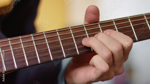 Close up hand of guitarist slides on fretboard