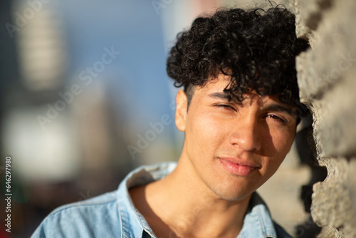man, 1, lifestyle, male, face, portrait, hispanic, latino, young, photogenic, cool, person, people, fashion, adult, looking, attractive, look, casual attire, guy, copy, fashionable, leisure, boy, stylish, single, curly, hair, background, relaxed, relax, staring, thinking, model, tough, macho, confidence, clothes, standing, wall, leaning, street, city, head, closeup