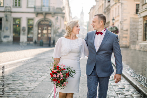 Close up horizontal shot of happy romantic mature couple in elegant fashionable clothes, walking in the street of old European city. Woman in white dress holds flower bouquet