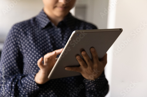 Close up Indian woman holding using tablet in hands, browsing apps, typing on screen, writing message, young female student or businesswoman working online, searching information, checking email