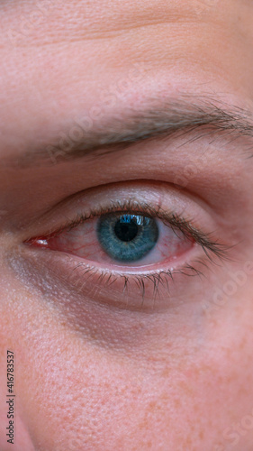 Close up irritated infected red bloodshot eyes. Conjunctivitis. Inflammation of the eyes. Mens red eye close-up, fatigue, problems with blood vessels. Red eye for irritation of the sclera