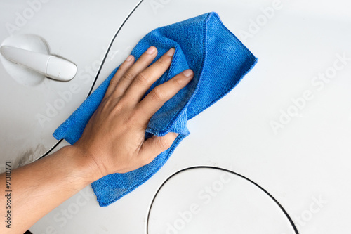 Close up male hand with blue microfiber cloth cleaning the car