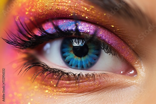 Close up micro picture of a person's eye with color decoration. Ai generated
