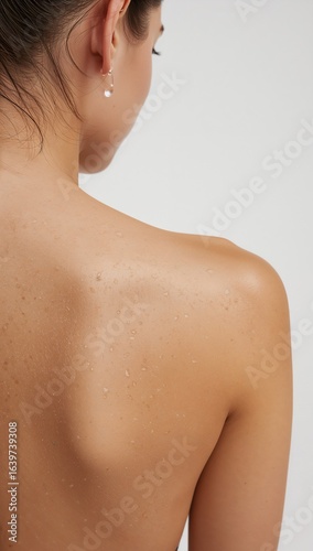 Close up of a female back shoulder with water droplets on plain white background