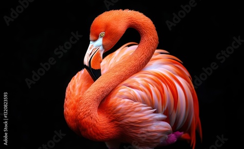 flamingo, preen, bird, standing, closeup, elegant, vibrant, wildlife, bright, detailed, exotic, feather, tropical, pink, orange, animal, neck, posing, looking, portrait, nature, fauna, avian, graceful, isolated, dark, background, studio, plumage, ornithology, vertebrate, natural, pattern, texture, awareness, conservation, zoology, backlit