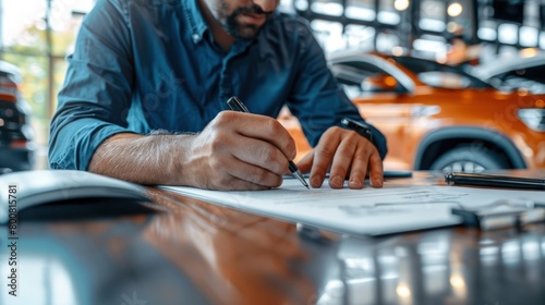 Close up of a man's hands signing a car sale. Generate AI image