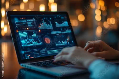 Close up of a person's hands typing on a laptop with a glowing blue screen full of data charts and graphs.