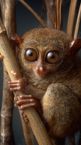 Close up of a tarsier with large eyes clinging to a branch in nature